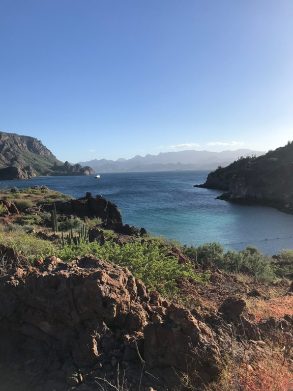 (L) Looking out over Honeymoon Bay. Photo by Linda Zath. // (R) A short hike on Isla Danzante above Honeymoon Bay. Photo by Linda Zath.