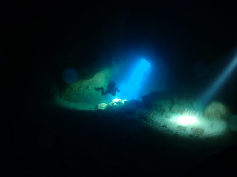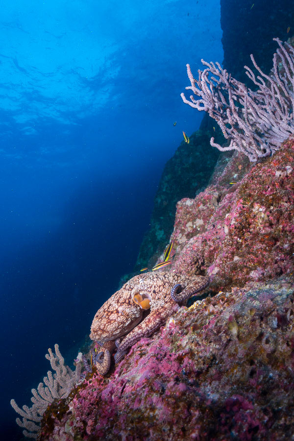 (L) Divers in the cavern. Photo by Steve Zimmerman. // (R) Octopus moving along a wall outside La Caverna. Photo by Lee Duckwall.