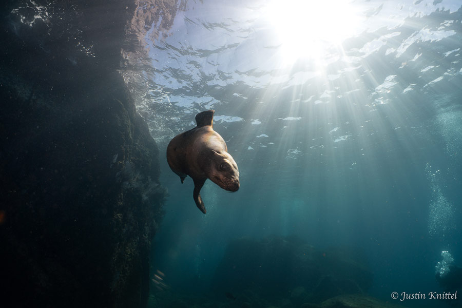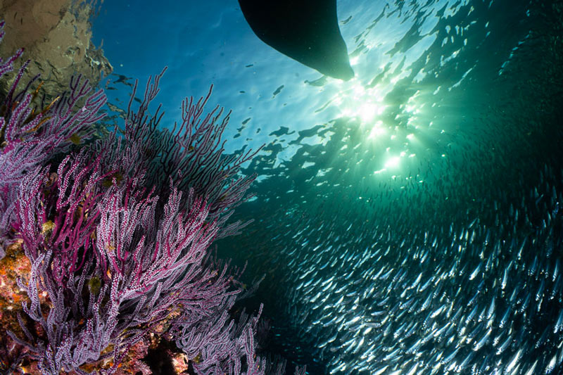 (L) A sea lion playing in the sun. Photo by Justin Knittel. // (R) A sea lion, sardines and soft coral highlighted by the sun. Photo by Scott Lucas.