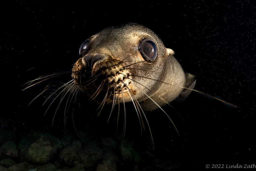 (L) Juvenile Sea Lion peeks out of the dark inspecting a divers dome. Photographed with Canon EOS R5 and Canon EF8-15mm fisheye lens in an Isotta R5 housing with Ikelite DS160 Strobes at f/8, 1/250, ISO 500 by Linda Zath. // (R) Night dive with Mobula Rays Photo by Lee Duckwall.