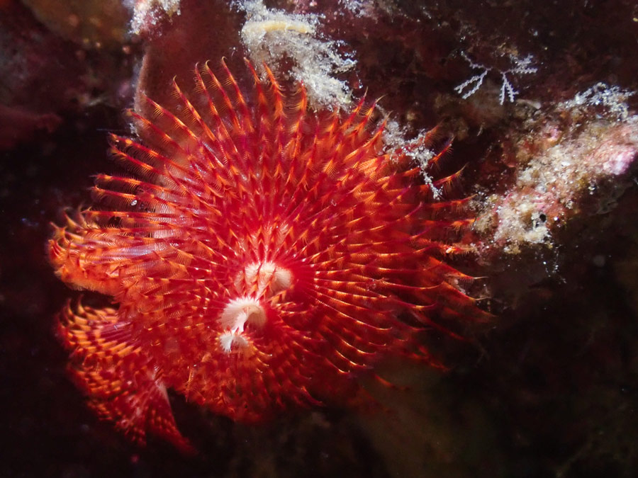 On the second to last day, the captain took us to a famous seamount, La Reina, which translates to the queen. There were strong currents but this brought in a huge school of fish that hangs out near the canyon in the middle of the seamount. There were also plenty of nudibranchs in the rocks, including flabellinas laying eggs!