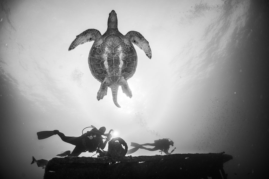 (L) A Sea turtle glides above the Fang Ming wreck with divers silhouetted in the background. Photo by Scott Lucas. // (M) A Seahorse at Swanee reef. Photographed with Canon EOS R5 and Canon RF 100mm macro lens in an Isotta R5 housing with Ikelite DS160 Strobes at f/ 7.1, 1/160, ISO 200 by Linda Zath. // (R) A scuba diver celebrating halloween. Photographed with Canon EOS R5 and Canon EF8-15mm fisheye lens in an Isotta R5 housing with Ikelite DS160 Strobes at f/7.1, 1/160, ISO 200 by Linda Zath