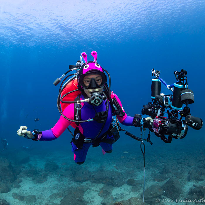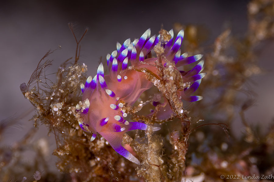 (L) Two curious Sea Lions inspect a diver at San Pedro Martir. Photographed with Canon EOS R5 and Canon EF8-15mm fisheye lens in an Isotta R5 housing with Ikelite DS160 Strobes at f/7.1, 1/250, ISO 320 by Linda Zath. // (M) Sea Lions raft on the surface at San Pedro Martir. Photographed withCanon EOS R5and Canon EF8-15mm fisheye lens in an Isotta R5 housing with Ikelite DS160 Strobes at f/7.1, 1/200, ISO 500 by Linda Zath. // (R) Nudibranch Flabellina (Flabellina exoptata). Photographed with Canon EOS R5 and Canon RF 100mm macro lens in an Isotta R5 housing with Ikelite DS160 Strobes at f/10, 1/160, ISO 100 by Linda Zath