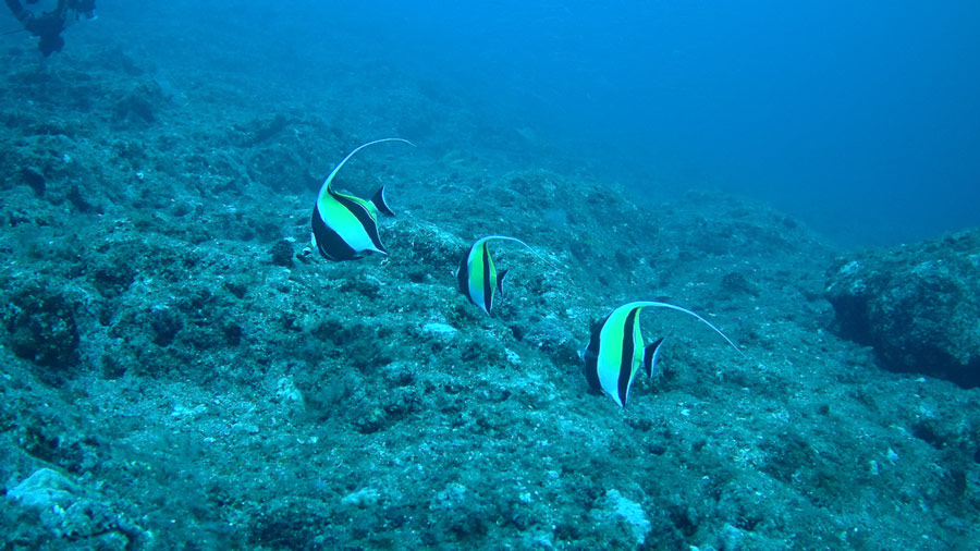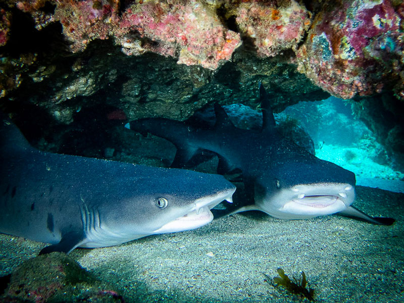 (L) White tipped reef sharks rest under a coral head. Photo by Melissa Foo. // (M) Moorish Idol (Zanclus Cornutus) near the Sand Falls at Pelican Rock dive site. Photo by Pam Elza. // (R) Humpback whales migrating north through the Sea of Cortez. Photographed with Canon EOS R5 and Canon EF 70-200 lens, 2x Extender at f/10, 1/800, ISO 250 by Linda Zath