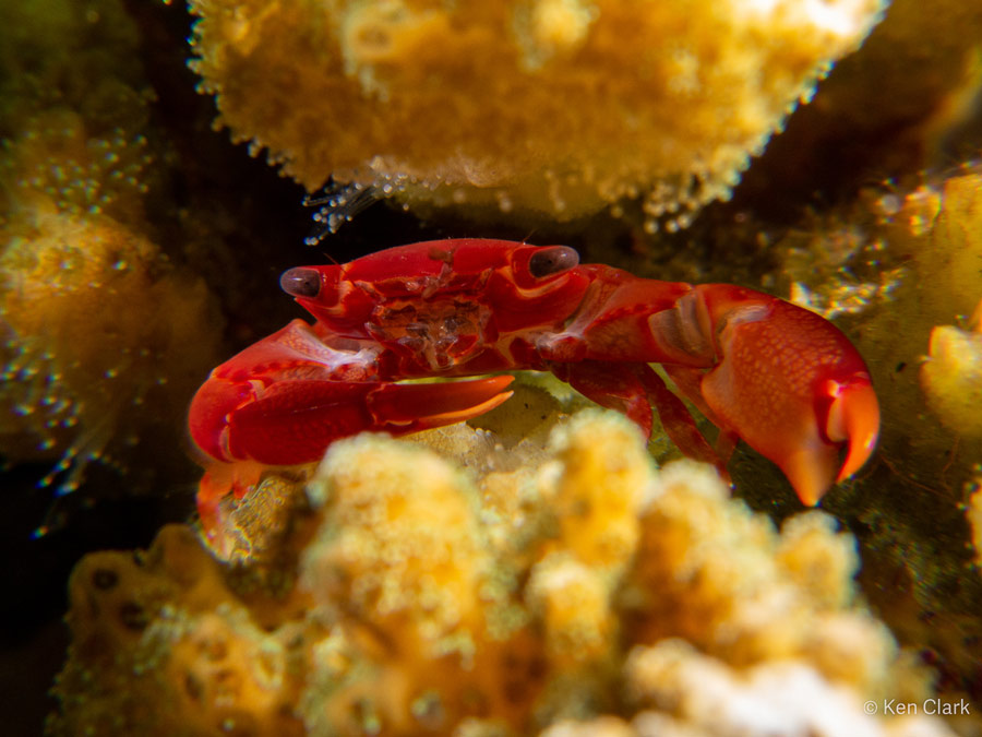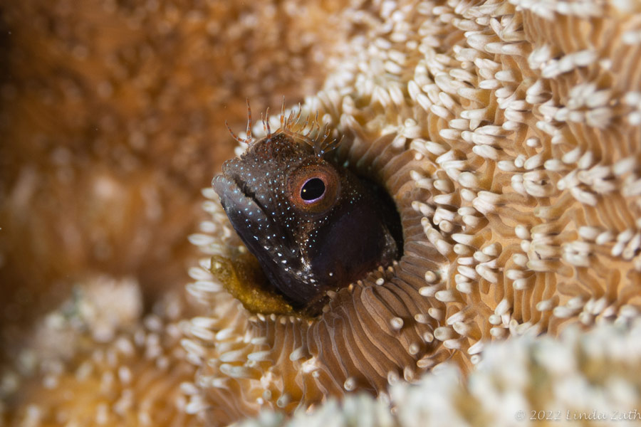 (L) A Brown Cheek Blenny (Acanthemblemaria crockeri) peeks out of its coral home. Photographed with Canon EOS R5 and Canon RF 100mm macro lens in an Isotta R5 housing with Ikelite DS160 Strobes at f/9, 1/125, ISO 160 by Linda Zath. // (R) Guard crab peeks out of coral. Photo by Ken Clark.