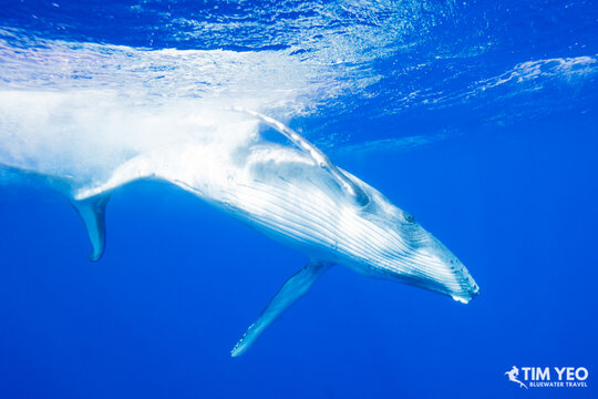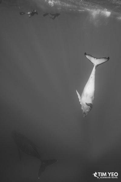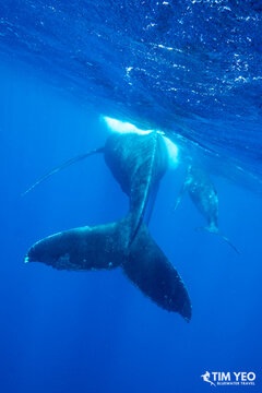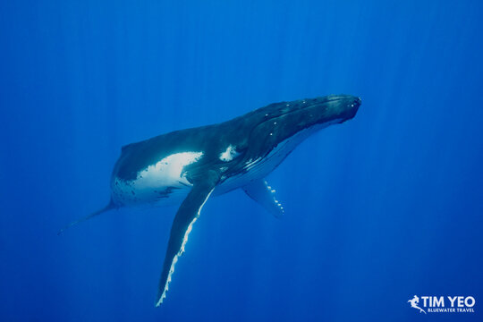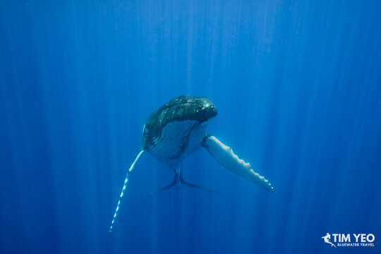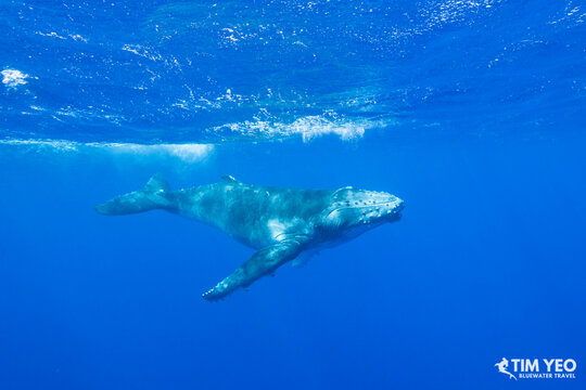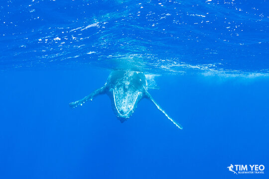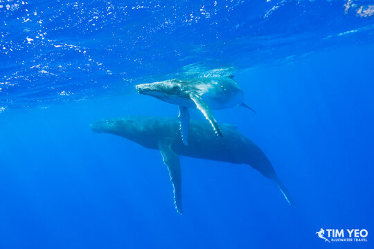 Humpback whales have four behaviors: feeding, resting, moving, and socializing. The whales do their feeding in Antarctica, as those waters are rich with krill. The whales then migrate to Moorea to give birth and teach survival techniques to their newborns. The best interactions with humpback whales are when they are in resting mode. The mother humpback rests about 30 feet underwater and surfaces roughly every 20 minutes to breathe. Being a baby, the calf must surface every 2-3 minutes to breathe. After each surface break, the calf heads back down to join its mother. Like most babies, the calves are quite inquisitive and often approach snorkelers in the water.