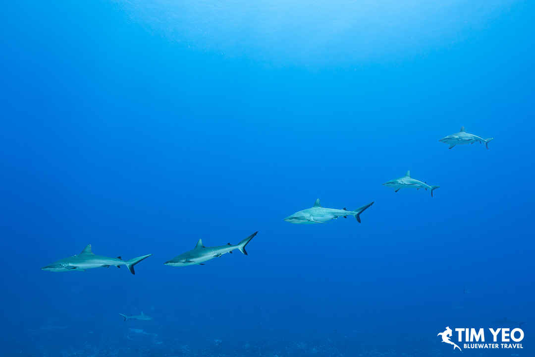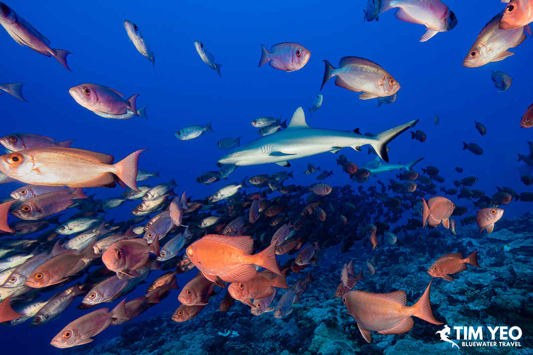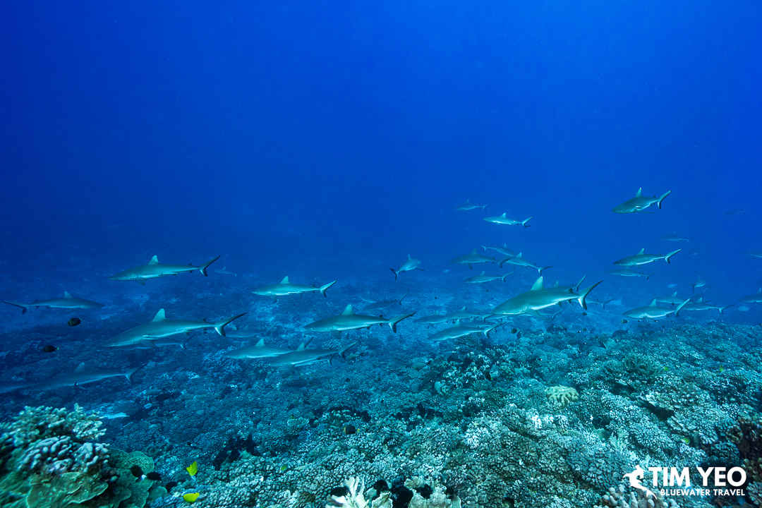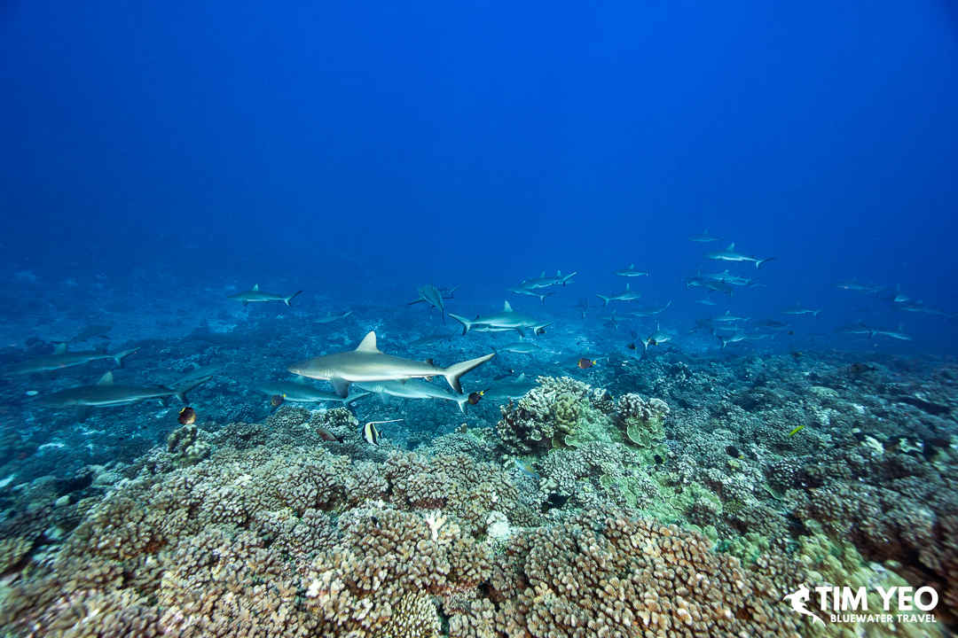 On our first diving day in Fakarava, we were greeted by schools of sharks on all our dives, with the second dive revealing a breathtaking wall of them. The underwater spectacle also included Napoleon wrasse and large clusters of paddletail snappers and red snappers.