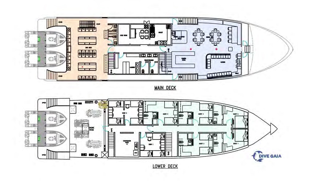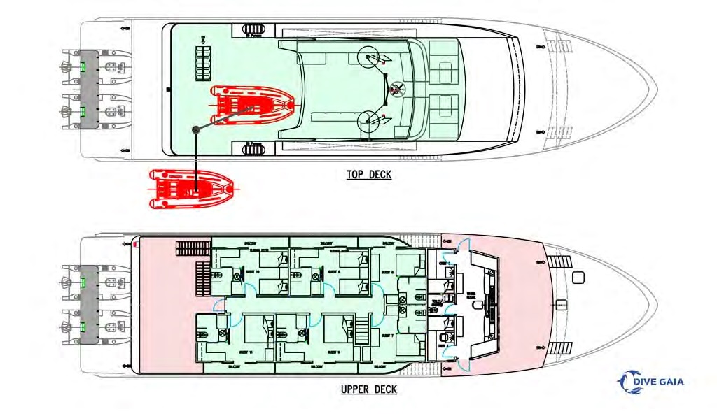 She accommodates up to 22 guest in 11 spacious ensuite rooms; six on the upper deck and five on the lower deck. Each room averages in size of approximately 20 square meters, individual air-conditioning and ensuite bathrooms with hot water. Upper deck rooms will feature an additional private outdoor balcony.