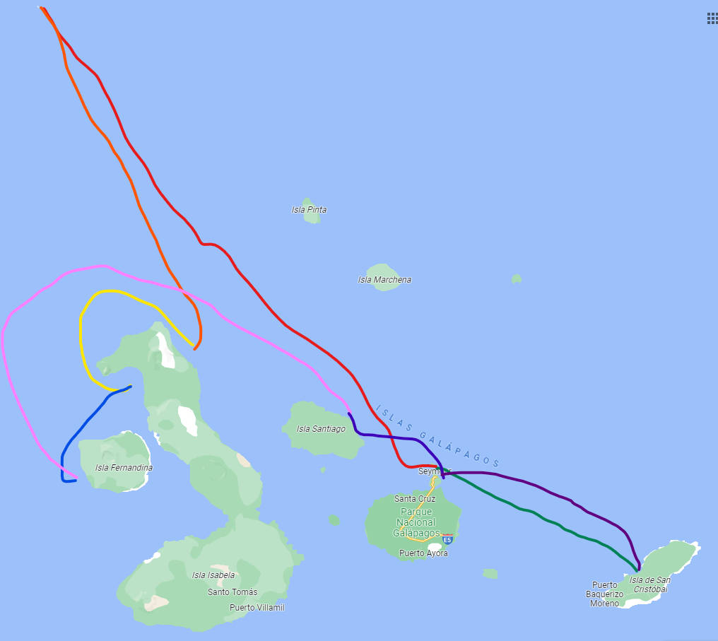 The route we have designed for our workshop ensures that divers are able to experience every aspect of the diversity the Galapagos has to offer. From the cold waters of the Cromwell current to the tropical waters of Wolf and Darwin, the goal is to witness as many unique animals as we can. The map below outlines our trip in the Islands with each day-long leg represented by a different color.