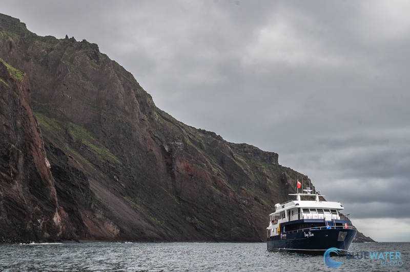 As our group gathered on Day 1 at the pier at San Cristobal, we were surrounded by the rambunctious barks of Galapagos Sea Lions. Shortly after, we boarded the dive pangas that we would use for the remainder of the trip and were whisked away to the Galapagos Master. Christened Deep Blue, the vessel is made for divers. It has a large dive deck on the stern where divers can suit up. The cabins are air-conditioned and relatively spacious with large en suite bathrooms, and there is a nice, large classroom in the bow of the main deck. Our group totaled 17 underwater photographers, video shooters, and divers, yet the vessel had plenty of space for us all to store camera equipment and set up before the dives.