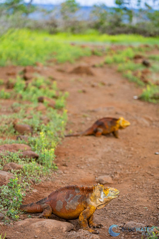 Male land iguanas size eachother up (L), A bluefooted booby, and a female frigatebird (R)