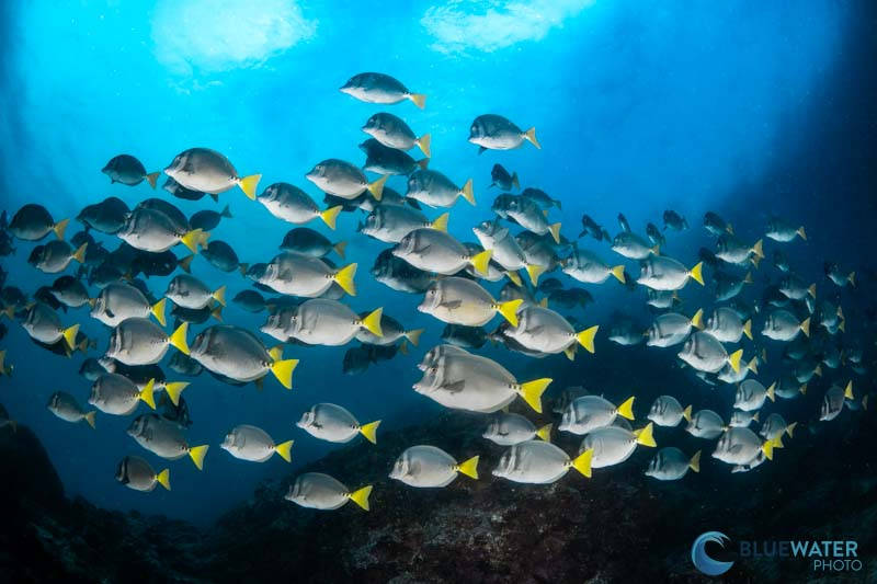 After the medical evacuation, we decided to dive where the speedboat picked up our guest on a lesser-dived area of the north side of Isabella Island. The site features large schools of yellow-tailed surgeonfish and we witnessed Galapagos penguins and flightless cormorants for the first time while diving a shallow lagoon.