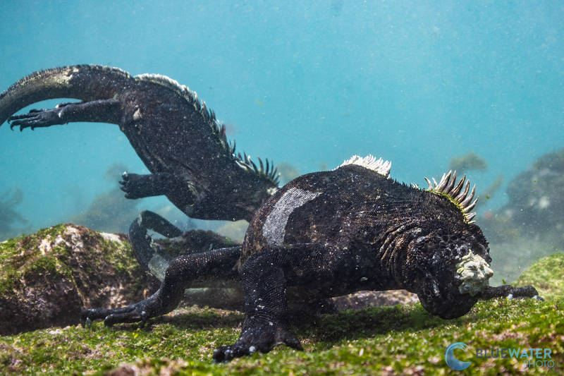 Charles Darwin was no fan of the Galapagos marine iguana. They are objectively ugly creatures with dark, pudgy faces and an insatiable appetite for sea lettuce. Yet, they are extremely charismatic and fun to watch, hopping from rock to rock to satisfy their hunger. After a successful day at Punta Vincente Roca, we moved to the volcanic island of Fernandina, the home of marine iguanas. We started the day with two deeper, cold (72 F) dives in the Cromwell current. We saw lots of blue-striped nudibranchs and red-lipped batfish. Around noon, the iguanas all began to enter the water and swim towards shallow "fields" of green sea lettuce. Our final dive of the day was a long dive watching the iguanas graze and climb over each other to reach the best feeding grounds. It was an incredible experience to be surrounded by hundreds of marine lizards.