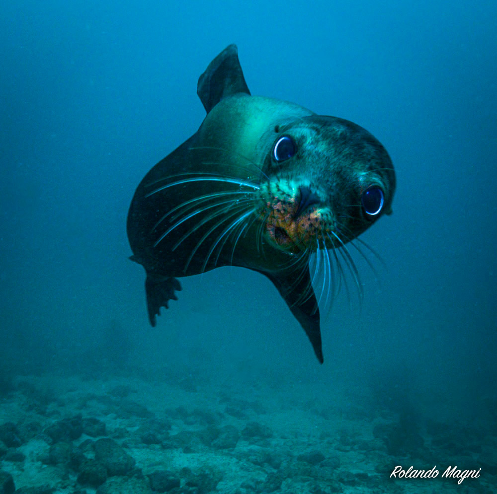 A moray eel on our second checkout dive at Seymour Island (L) &A playful Galapagos Sea Lion photographed by Rolando Magni (R)