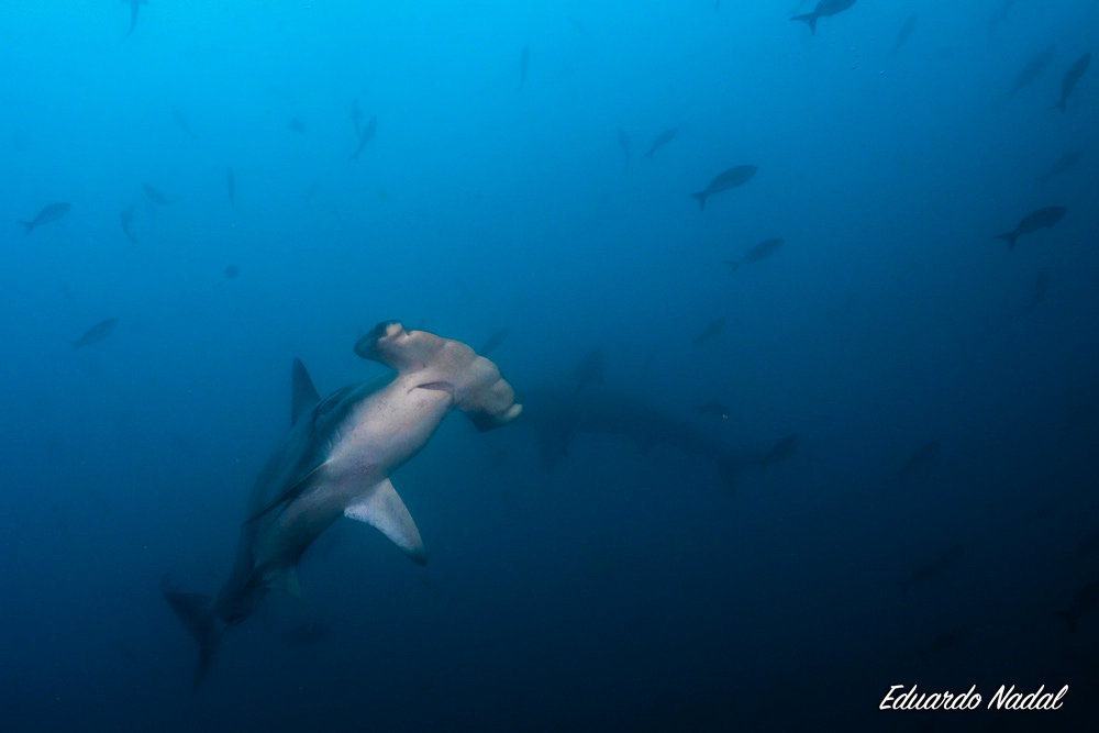 Schools of Yellowtail Surgeonfish (L) & A hammerhead at Roca Redonda photographed by Eduardo Nadal (R)