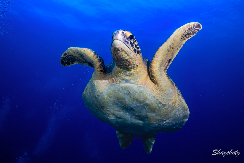 One of the many sea turtles at Darwin's Arch (L) & A beautiful sea turtle photographed by Sharron Bonnafoux (R)