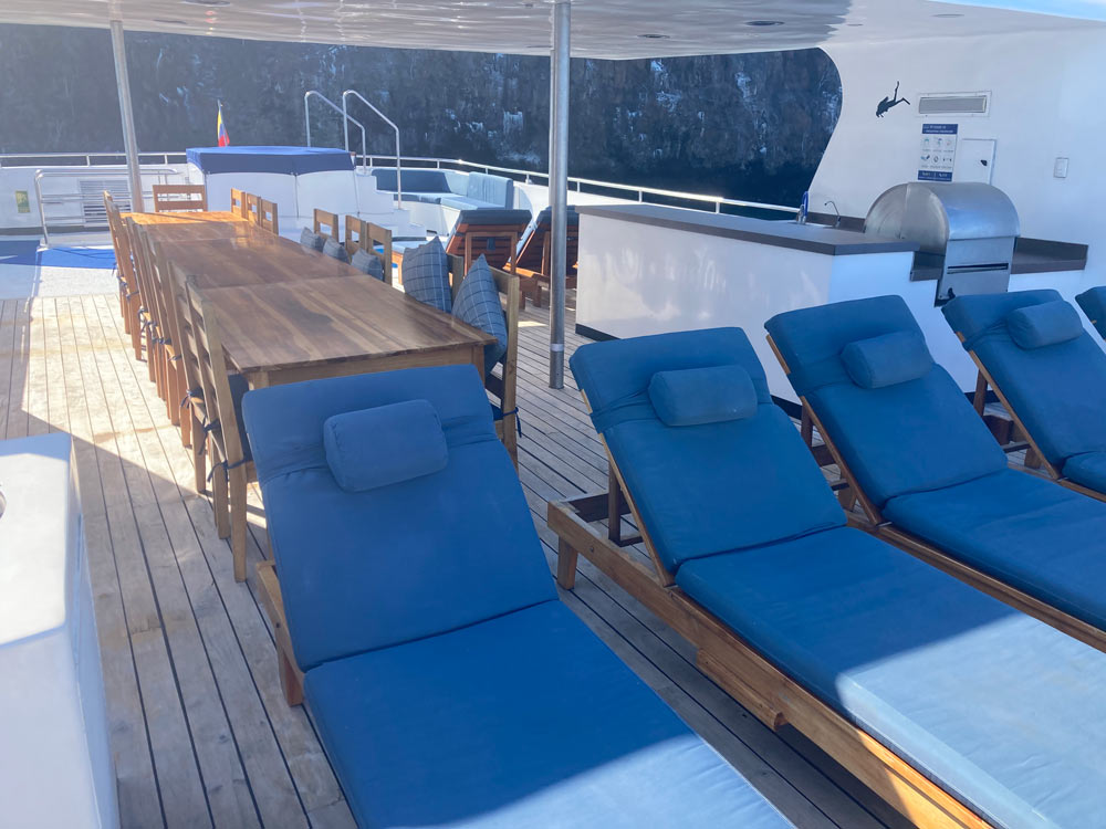 The top deck of the boat had an outdoor dining area, sun loungers, and a jacuzzi. I was impressed by how spacious this boat felt. Even with a full complement of guests, this would be a very comfortable boat.