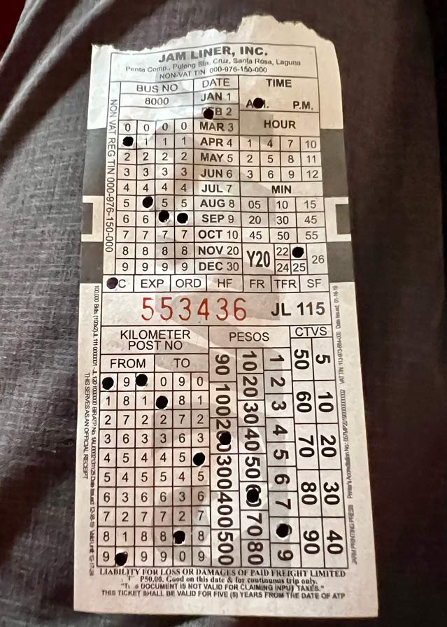 There is storage for your big bags, and you can bring your smaller carry-on bag on the bus with you. There is AC on the buses but no restrooms or Wi-Fi. Board the bus and find a seat while you wait for the departure time. My bus was about 75% full and departed at 7:05 am. After the bus departs, the bus conductor will come around to all guests and give you a ticket for the destination you are going to. After he is done giving everyone a ticket, he then comes back around to collect the fare. My fare from Manila to Batangas Pier was 260 PHP, which is about 5 USD at the current exchange rate.
