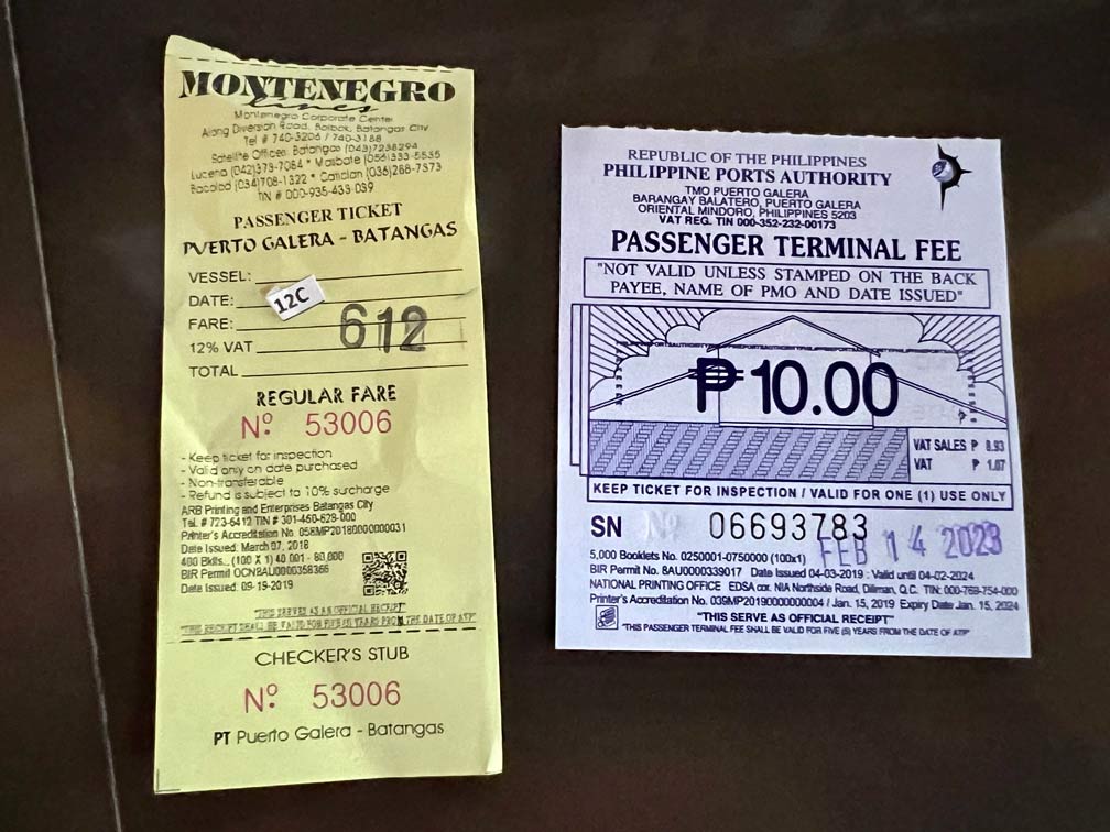 My ferry ticket cost 612 PHP (11 USD). After you purchase the ferry ticket, you have to go to another counter to purchase a terminal fee ticket, which costs 30 PHP (0.50 USD).