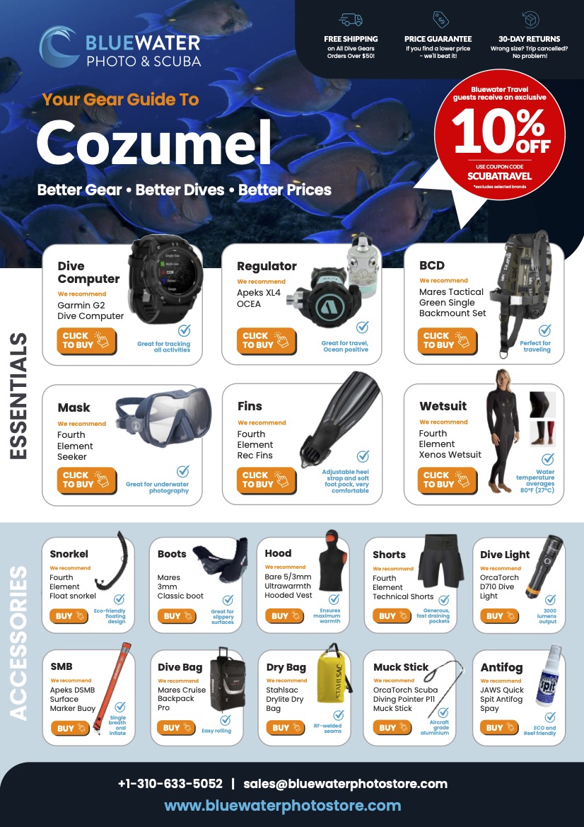 Download our full scuba gear guide to Cozumel, Bluewater Travel guests receive 10% OFF! Click the image below to download (PDF).