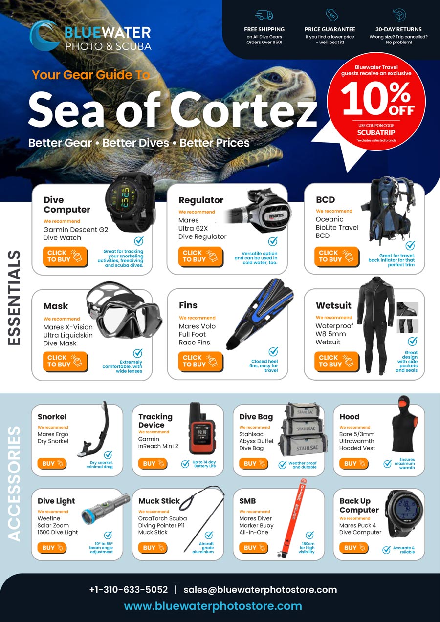 Download our full scuba gear guide to Sea of Cortez, Bluewater Travel guests receive 10% OFF!