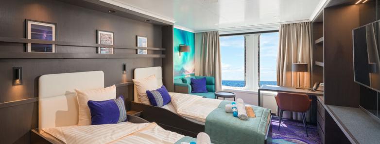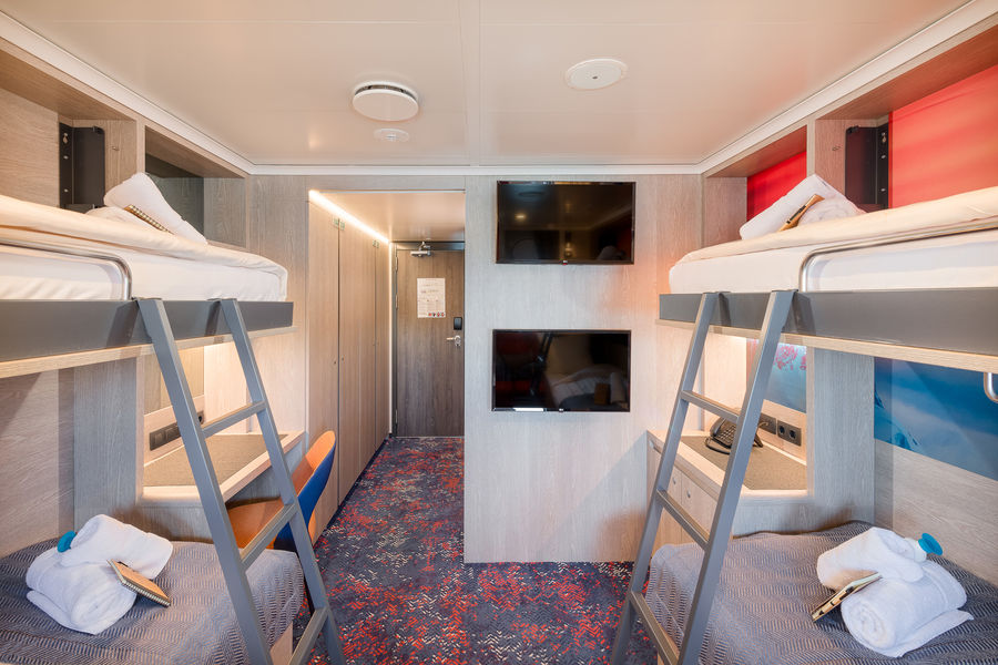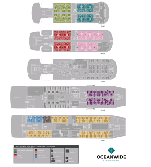 Hondius offers high-quality accommodation for 170 passengers in in 6 grand suites with balcony (27square meters), 8 junior suites (19-20square meters), 8 superior cabins (20-21square meters), 11 twin deluxe cabins (19-21square meters), 14 twin window cabins (12-14square meters), 27 twin porthole cabins, 2 triple porthole cabins and 4 quadruple porthole cabins (porthole cabin sizes vary from 12-18square meters.)