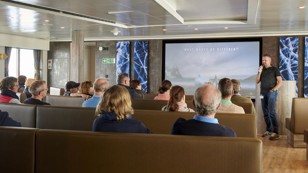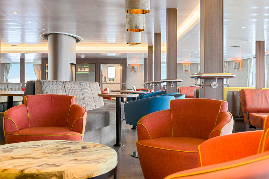 Spacious observation lounge (with bar) on deck 5 with large windows, offering full panorama view as well as lecture and observation decks
