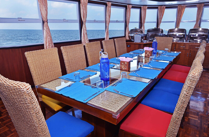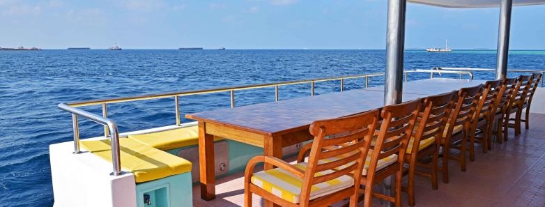 The Blue Horizon III anchors near the Male International Airport. All guests are provided with transport from the airport via Dhoni.