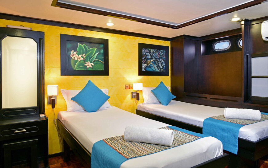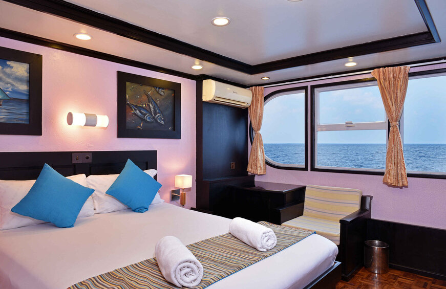 The Blue Horizon III accommodates 22 to 24 divers in 12 cabins. The 9 Twin/Standard Cabins contain double or twins beds, are fully air-conditioned and have plenty of storage. Maximum occupancy is 2 guests. The yacht also contains 2 Deluxe Cabins with a large sea view window. In addition to being fully air-conditioned, the cabins also have a massage shower and bathtub. The Deluxe Cabins accommodate 2 guests on a queen bed. The Blue Horizon also offers 1 Master Deluxe Cabin for 2 guests. The cabin also includes air conditioning, a private toilet, massage showers, and a bathtub.