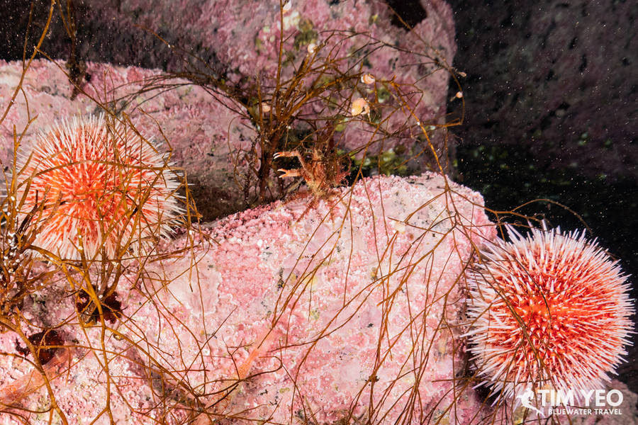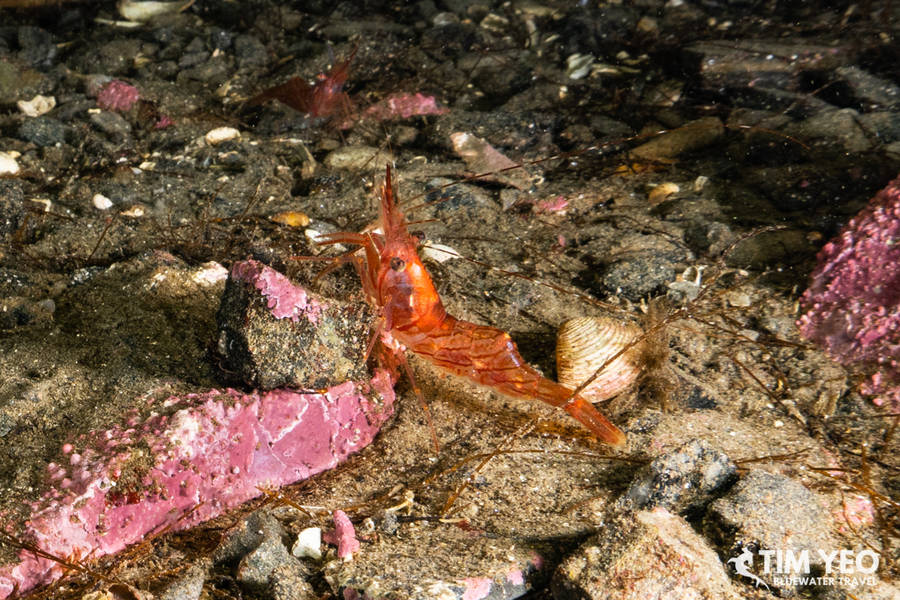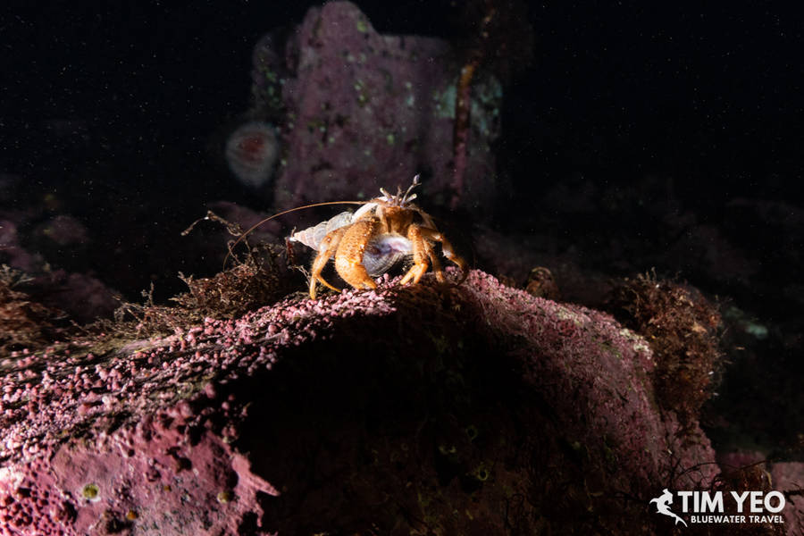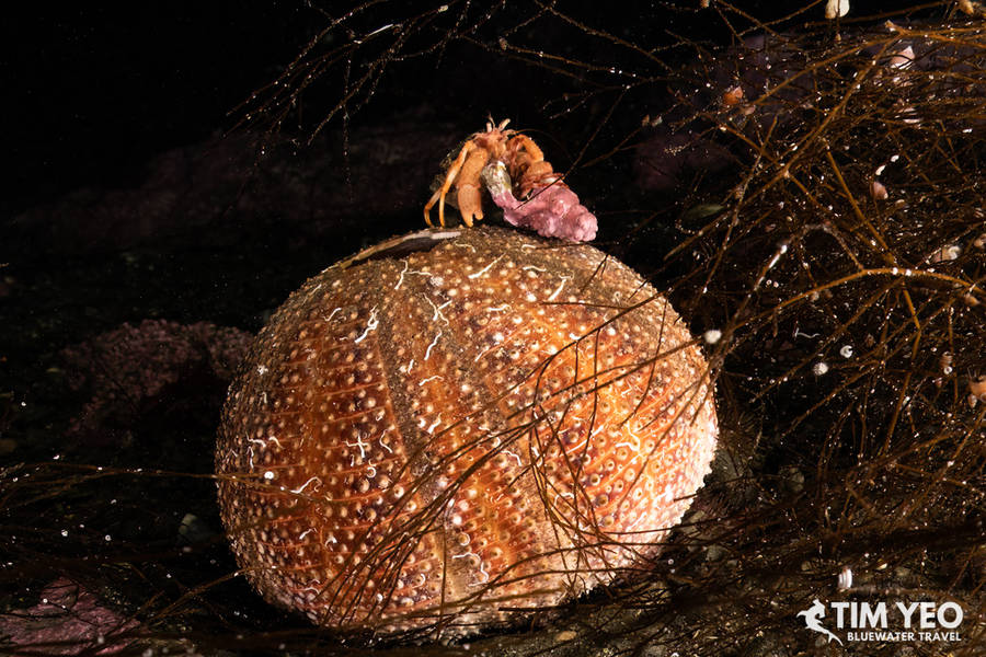 Hermit crab on top of an urchin shell (L) & Lots of shrimp and other macro subject to be found (R)
