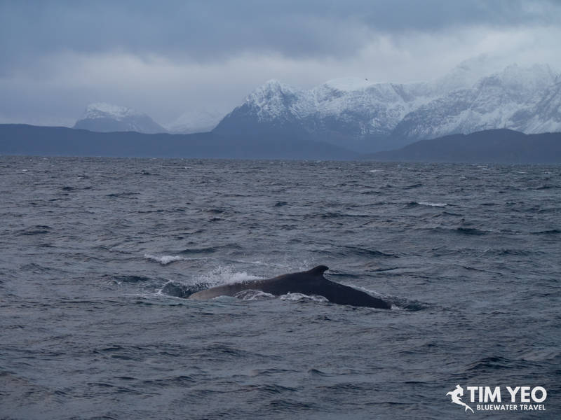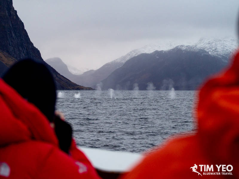Reports that the orcas had moved west meant taking the Maroy out to look for orcas. After about 4 hours of searching during the available daylight hours, we didnt get in the water but were treated to a congregation of 100 humpback whales on the surface. There were spouts all over the boat at any one time. Some of the humpbacks were also socializing with breaches and tail and fin slaps.