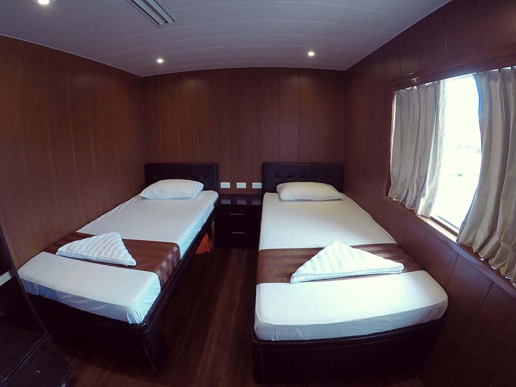 - Lower Deck Standard Cabins: 5 lower deck standard cabins, 2 with twin bunk beds, and 3 with 2 twins side by side beds an extra bed for families or friends wanting to be in the same cabin.