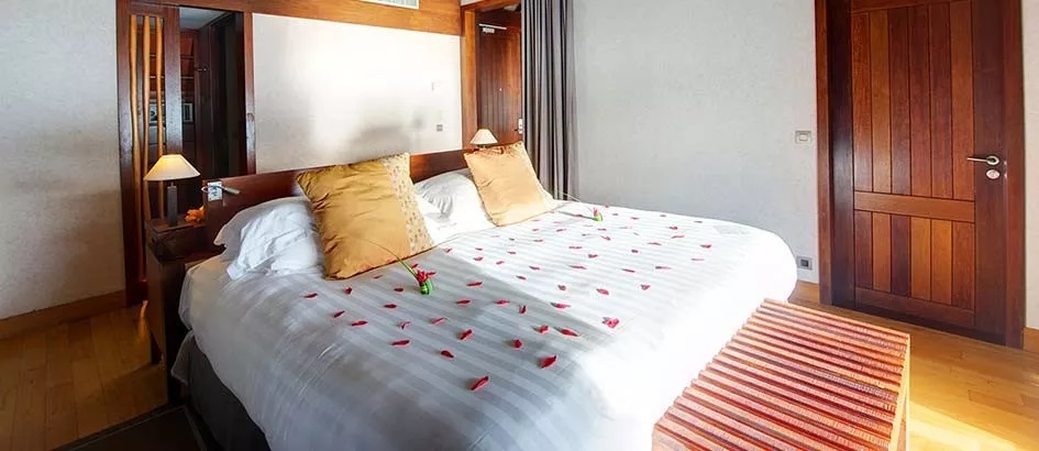 Discover luxurious Emerald Overwater Villas, featuring stunning lagoon views, a plush king-size bed, spacious living area, and private terrace for ultimate relaxation.