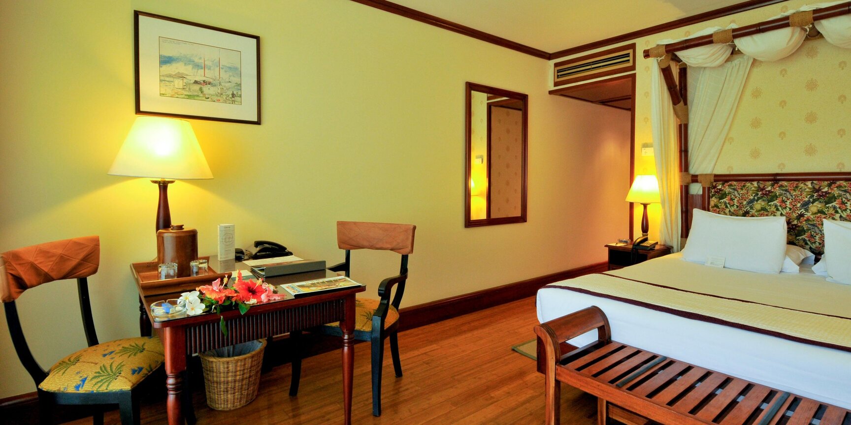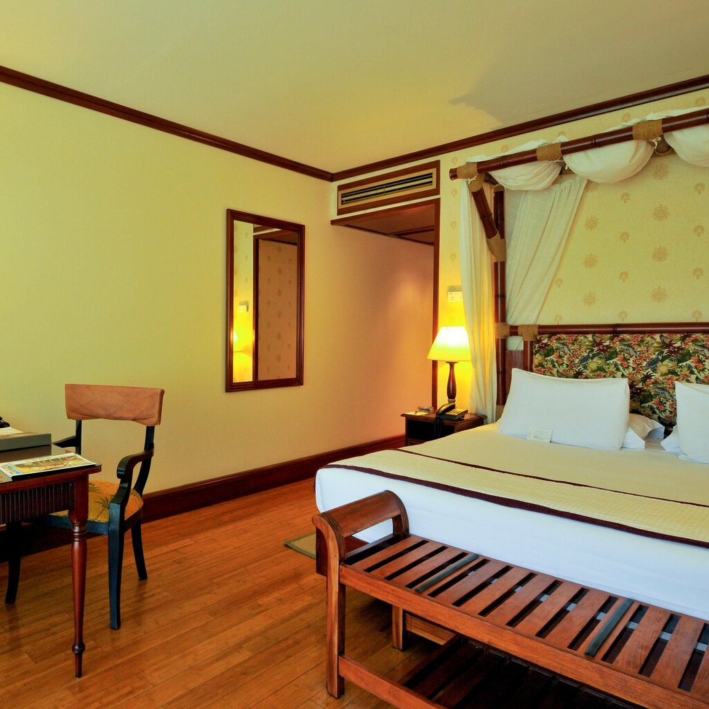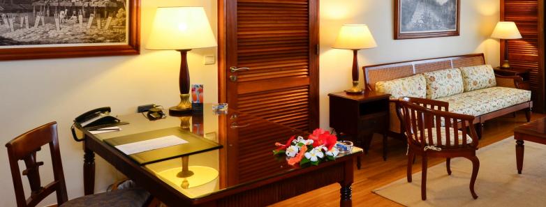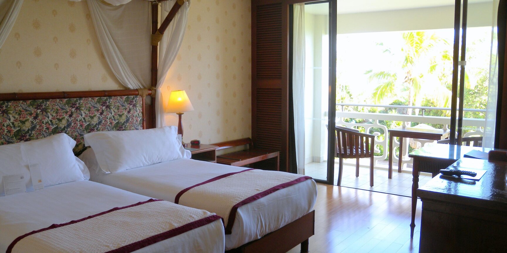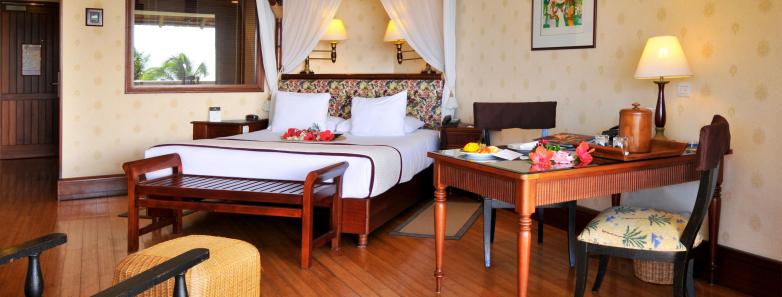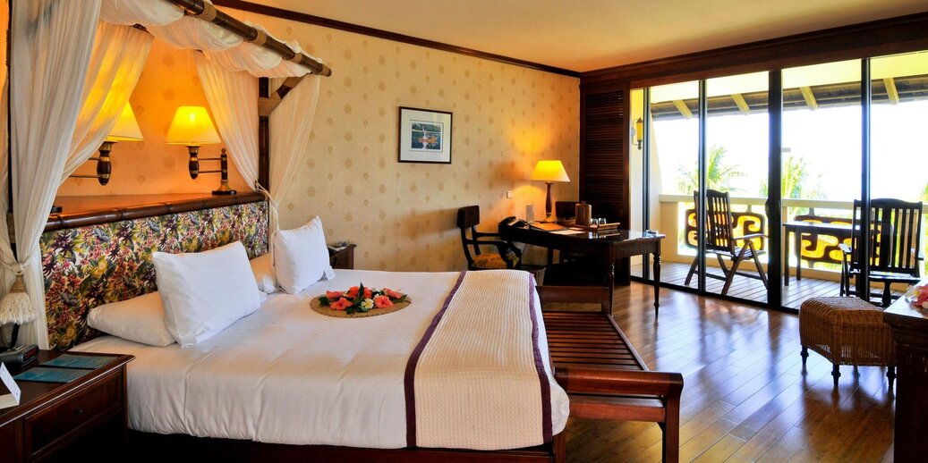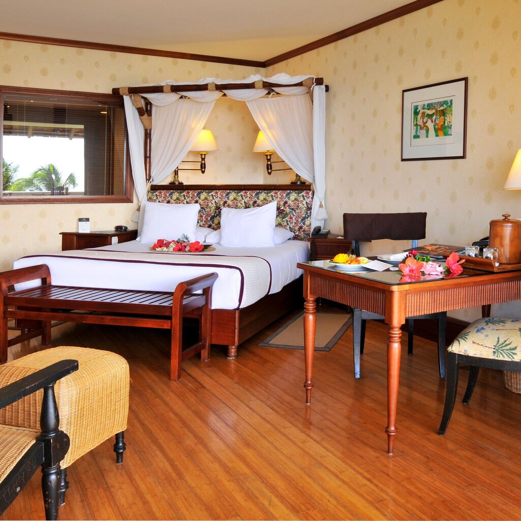 A serene twin/double room featuring Polynesian-inspired décor, natural timber floors, and a private balcony overlooking lush gardens or the lagoon.