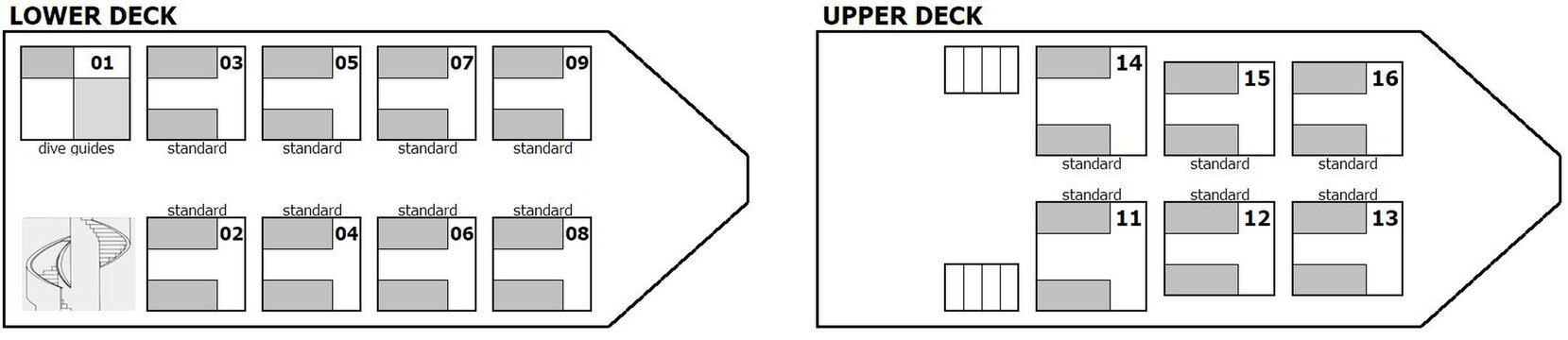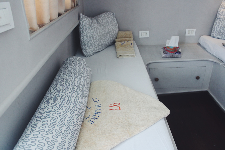 The M/Y JPMarine offers guests 14 twin superior cabins, all equipped with a private shower and toilet facilities. There are 6 cabins located on the sundeck and another 8 located on the lower deck. All the cabins are fully air-conditioned.