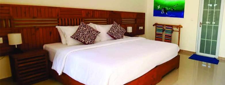 The Kamadhoo Inn offers two types of accommodations: the Double Room (13) or the Family Room (1.) The rooms are comfortable and spacious, designed with a touch of Maldavian flair. The Double Rooms are located on the ground and first floors, and can comfortably accommodate a couple or friends who want to share a room. The Family Room is located on the first floor and is perfect for small families, accommodating up to 4 people. The room features a king size bed, a single bed, as well as a small living area with a sofa.