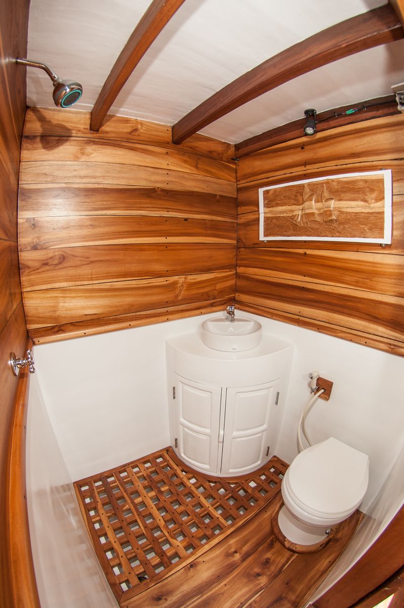 The liveaboard accommodates up to eight guests across four cabins, featuring three twin cabins and one double cabin. Each cabin is equipped with a wardrobe, a computer/gadget desk, portholes for natural light, and a fan for added comfort. Guests share bathroom facilities, ensuring a well-appointed yet social onboard experience.