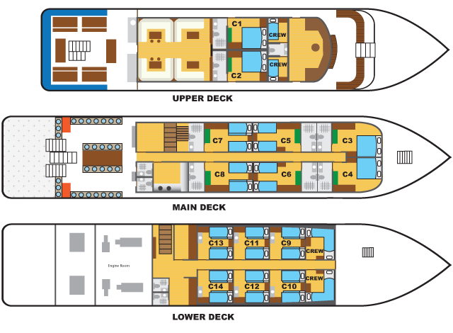 All ensuite cabins are on the main deck and upper deck,have amber storage space for luggage with camera table, a spacious toilet with hot water shower, and aircon with individual control. Cabins also have large windows that can be open.