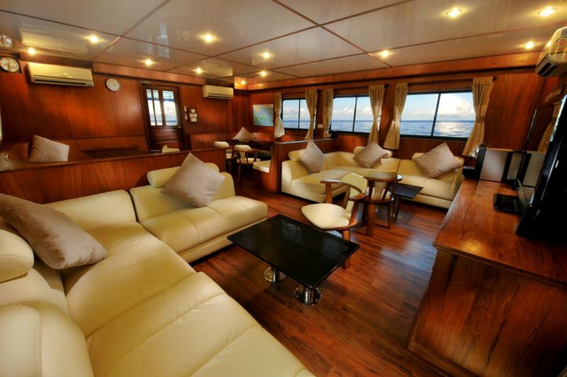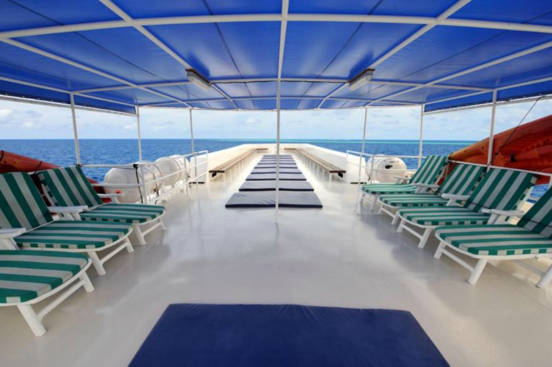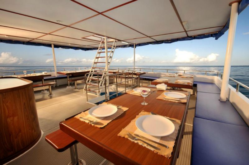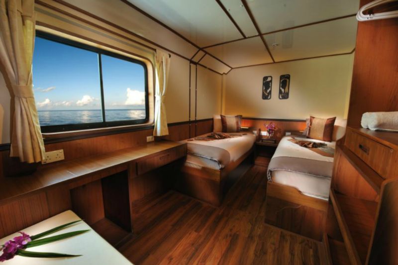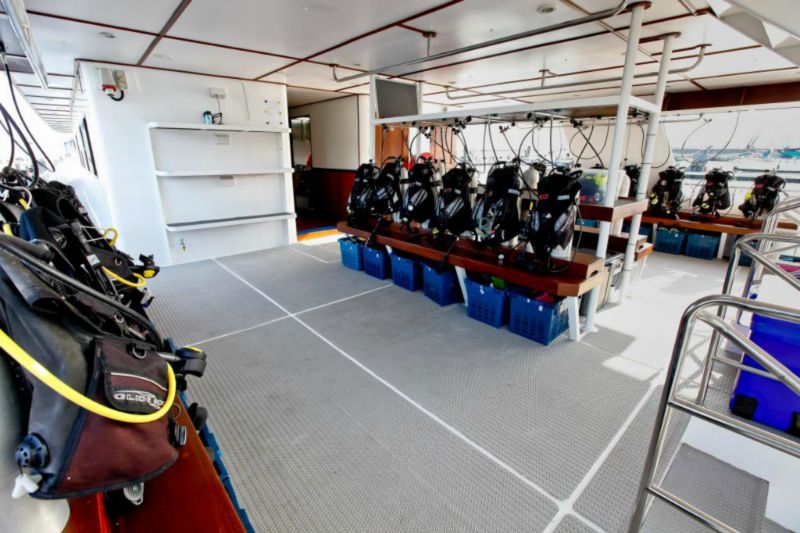 Three plentiful meals a day are prepared by a fantastic chef. A blend of Western and Asian Cuisine awaits guests after every dive. Light breakfast and afternoon snacks complete the ensemble and a delightful array of fresh tropical fruits accompanies every meal. Further snacks, tea, coffee, hot chocolate, and drinking water are available all day. The refrigerator is stocked with chilled drinks which can be purchased at reasonable prices whilst a Nespresso coffee machine takes care of caffeine addicts.
