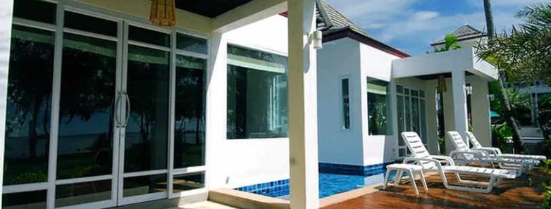 A roomy 95 m² beachfront villa with a bedroom and living area, featuring a private shared swimming pool
