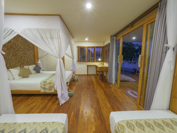 Nestled on Sebayur Island, Komodo Resort offers 26 elegantly crafted bungalows and suites made from sustainably sourced teak wood, blending natural materials with modern comforts. Guests can choose from cozy Private Bamboo Bungalows, 48 sqm Ocean View Bungalows with stunning sea vistas, spacious two-bedroom Family Bungalows accommodating up to four people, luxurious Grand View suites with panoramic ocean views, beachfront Grand Beach bungalows with direct access to the sand and house reef, and the grand 72 sqm Presidential Suite featuring deluxe amenities and sweeping ocean vistas. All accommodations are equipped with air conditioning, private bathrooms, terraces, hot water, ceiling fans, 24-hour electricity, minibars, safety boxes, and WiFi, with daily housekeeping and turndown service, ensuring a comfortable stay just steps from the pristine beach and vibrant house reef.[Read More: Komodo Dive Travel Guide]