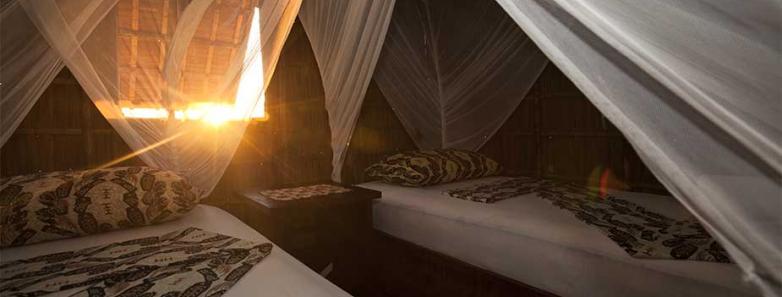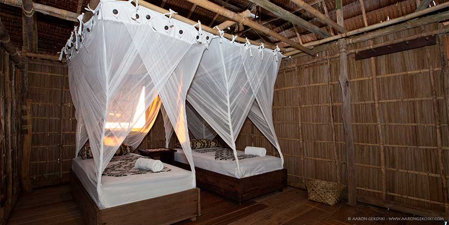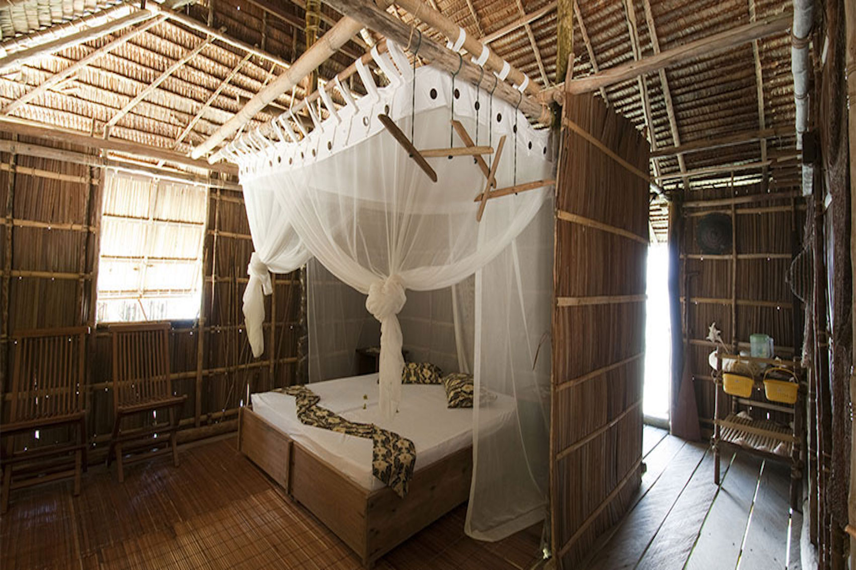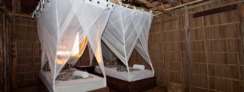 Relax in a cozy room featuring a Western-style bed, mosquito nets, 24/7 electric fan, ensuite bathrooms, and direct ocean access.