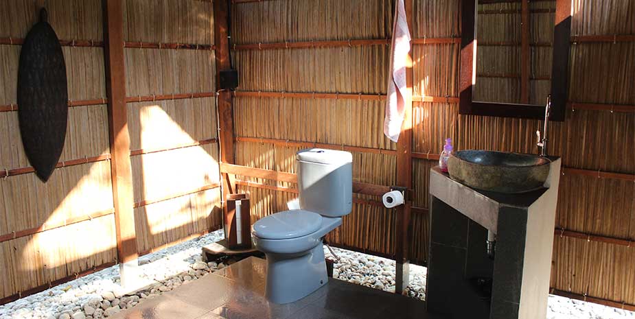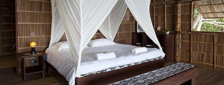 Relax in a cozy room with a western-style bed, mosquito nets, electric fan, and easy access to traditional Indonesian mandi.