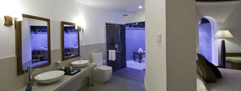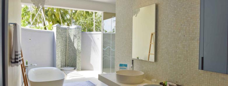 Escape to a serene Beach Villa, featuring a king-sized four-poster bed, private deck, and outdoor rainfall shower, steps from the beach.