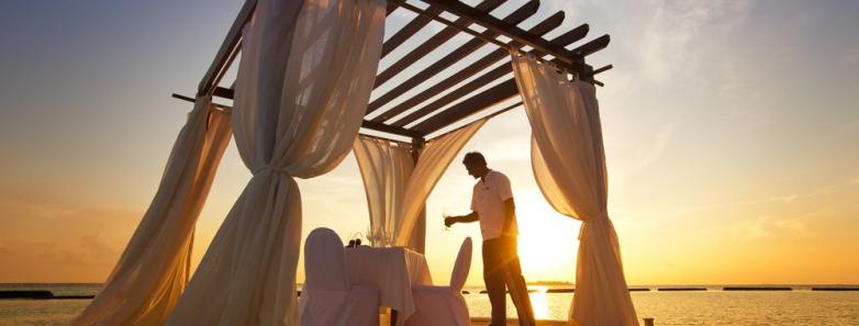 • No interruptions. Just the two of you and the sounds of the sea. The stars above. Sumptuous courses arrive, one after the other. Perfect romantic dinner with thoughtfully matched fine wines. You toast. Eyes meet, telling stories. Everything perfect. Personal butler on hand. You will remember this night. The cool sand underfoot, the moonlit waves stretch onward.