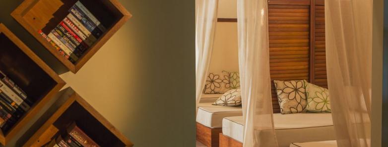 Relax in our conveniently located room featuring an open-plan bathroom, two cozy daybeds, and a choice of a downstairs terrace or upstairs balcony.