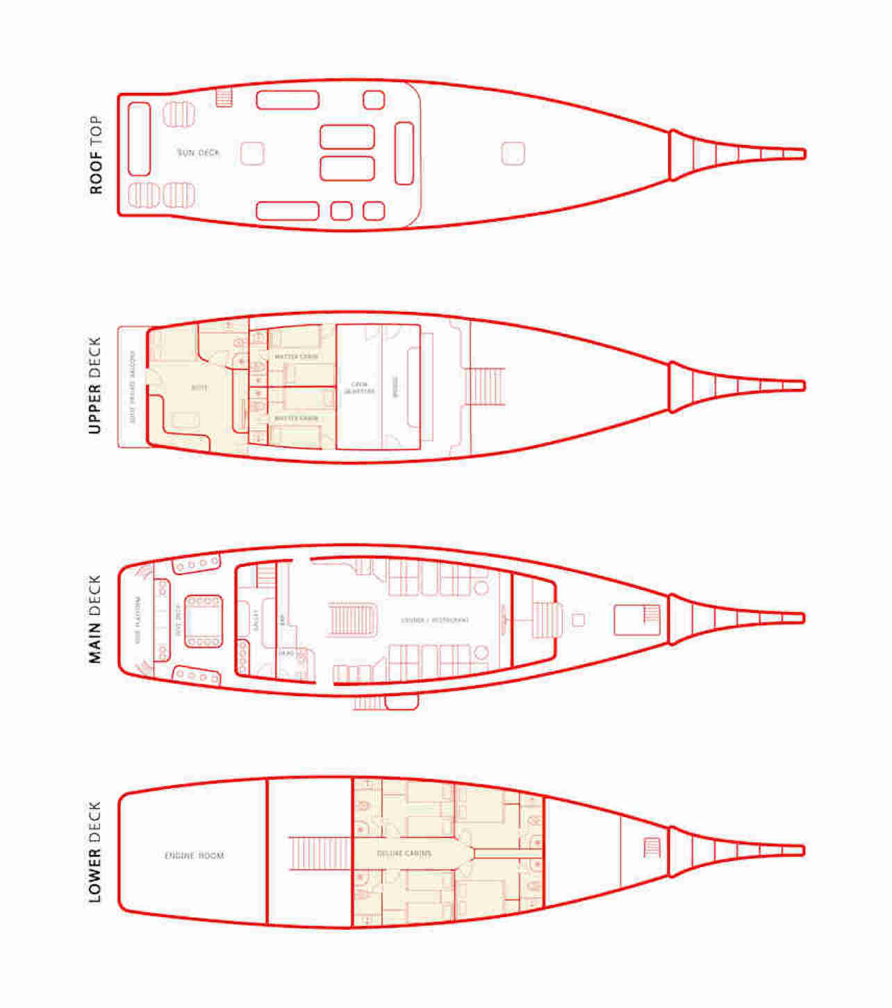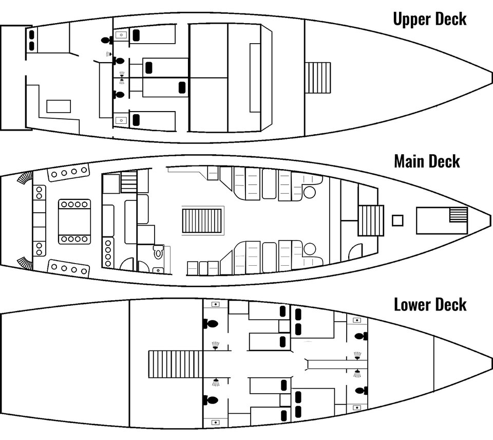 La Galigo has 7 privately controlled air-conditioned, en-suite cabins each with an American-style deep spring mattress. Cabins are either twin or double bed.