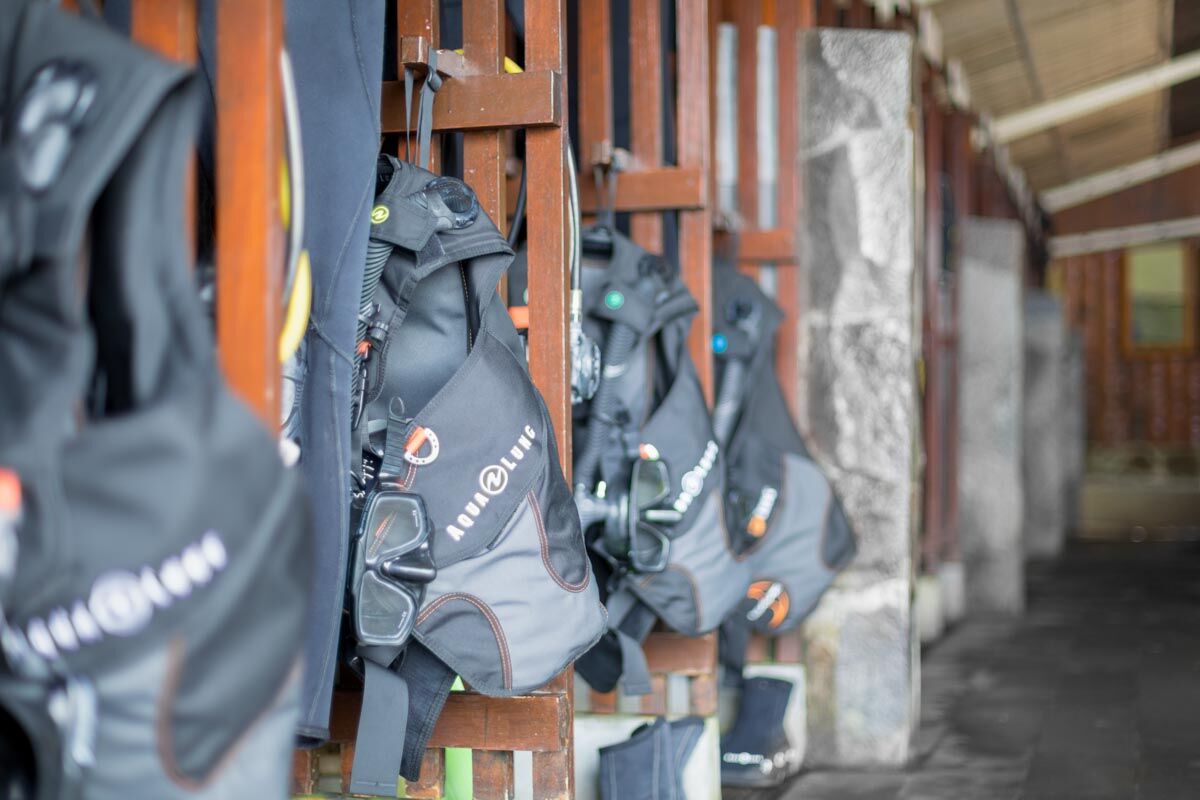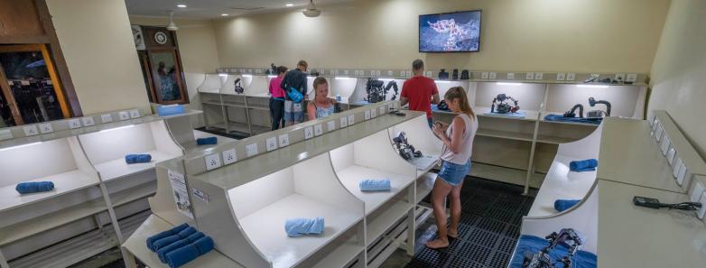 The resorts dive center Critters@LembehResort is a fully operating facility. Each diver has its own spacious, personal locker area with drying pegs for boots and hangers for suits and BCs. There are long benches for kitting-up and a briefing area with big whiteboards to help you plan your diving program and keep an eye on the days events.