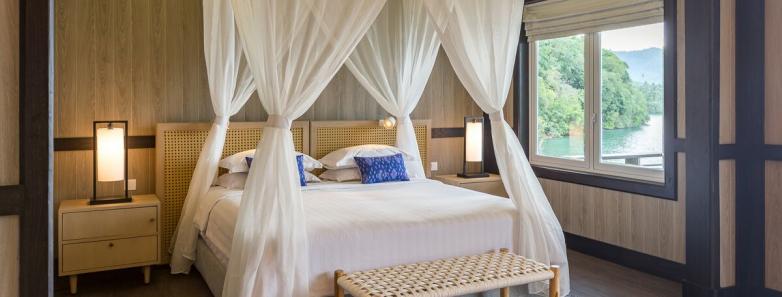 Guests of Lembeh Resort have a choice of 3 different categories of accommodations, Deluxe Ocean View Cottages, Garden View Rooms, and Cliffside Villa. Due to Lembeh Resorts' remote tropical island location, accommodations come with a full board meal plan 3 sumptuous meals daily, along with snacks, coffee, & tea. Rooms are equipped with: