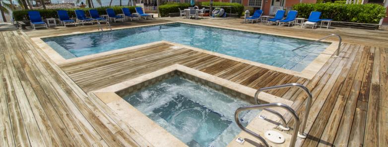 The 28 deluxe pool view hotel rooms encircle the pool. They are spacious, air-conditioned and have a tasteful tropical decor. Each room features: